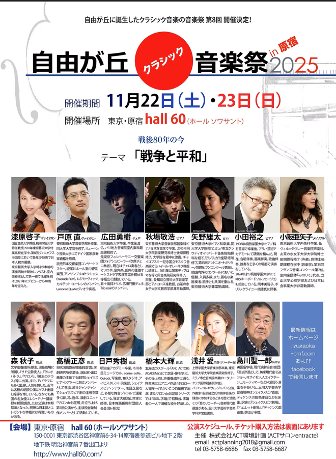 【2025/11/22】自由が丘クラシック音楽祭2025 in 原宿~漆原啓子&秋場敬浩(東京都) 2025年11月22日(土)17:00開演 hall 60(ホール・ソワサント/原宿) 共演:漆原啓子(ヴァイオリン) エルガー:ヴァイオリン・ソナタ ホ短調 op.82 プロコフィエフ:ヴァイオリン・ソナタ第1番 へ短調 Op. 80 【お問合せ・お申込み】https://www.jiyugaoka-cmf.com/ [ 【2025/11/22】自由が丘クラシック音楽祭2025 i... ]Archive 20252025/09/12 23:30