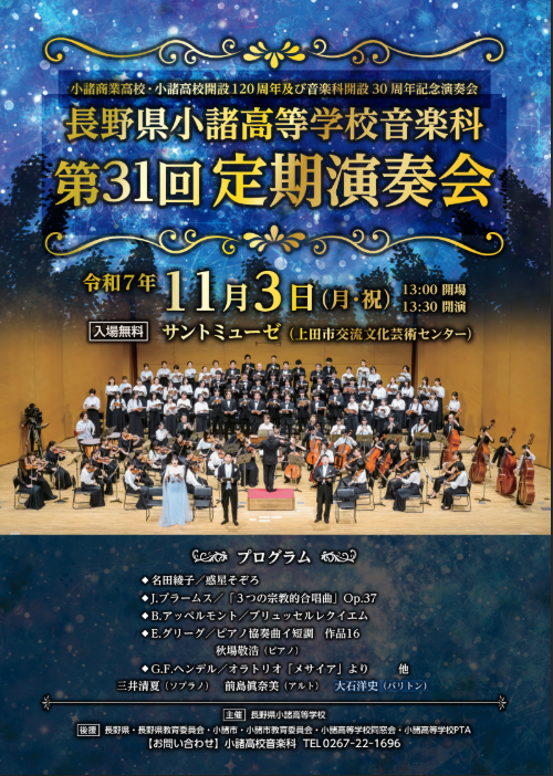 【2025/11/03】小諸高等学校音楽科第31回定期演奏会(長野県) 2025年11月3日(日)13:30開演 サントミューゼ 大ホール(上田市交流文化芸術センター) グリーグ ピアノ協奏曲 イ短調 op.16、ほか [ 【2025/11/03】小諸高等学校音楽科第31回定期演奏会... ]Archive 20252025/07/05 23:41