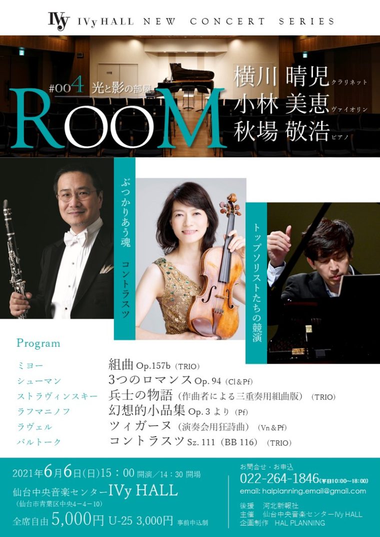 【2021/06/06】ROOMシリーズ Vol. 4「光と影」(仙台市) 2021年6月6日(日)15:00開演 @ 仙台中央音楽センター IVy Hall 出演:横川晴児(Cl)、小林美恵(Vn)、秋場敬浩(Pf) ミヨー、シューマン、ストラヴィンスキー、ラフマニノフ、ラヴェル、バルトークの作品 [ 【2021/06/06】ROOMシリーズ Vol. 4「光と... ]Archive 20212021/04/19 22:04