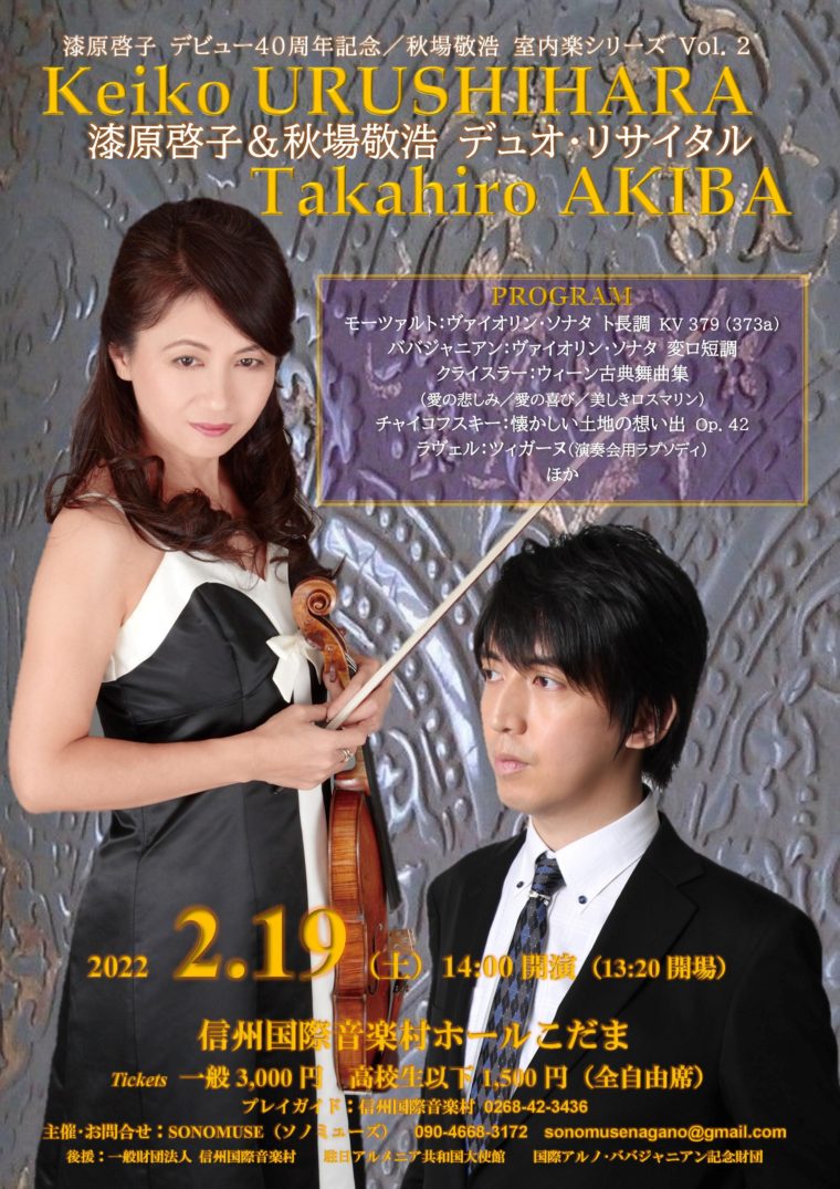 【2022/02/19】漆原啓子&秋場敬浩 デュオリサイタル(上田市) 2022年2月19日(土)14:00開演@信州国際音楽村ホールこだま モーツァルト、ババジャニアンのソナタ、クライスラー、チャイコフスキー、ラヴェルの小品、ほか 主催:SONOMUSE 後援:駐日アルメニア共和国大使館 [ 【2022/02/19】漆原啓子&秋場敬浩 デュオリサイタル... ]Archive 20222021/09/25 00:00