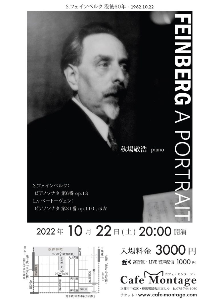 【2022/10/22】「フェインベルクの肖像」秋場敬浩 ピアノリサイタル(S. フェインベルク没後60年の命日に)(京都府) 2022年10月22日(土)20:00開演@カフェ・モンタージュ(京都市) バッハ=フェインベルク、ベートーヴェン、フェインベルクの作品 お問合せ:https://www.cafe-montage.com/prg/221022.html(カフェ・モンタージュ公式サイト) [ 【2022/10/22】「フェインベルクの肖像」秋場敬浩 ピ... ]Archive 20222022/05/27 19:02